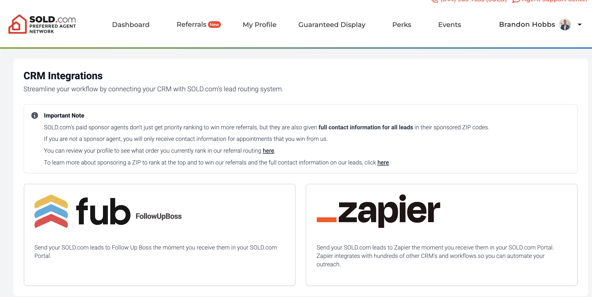 Yes, SOLD.com offers integration with Follow Up Boss (FUB) CRM, making it easier to manage your leads seamlessly. If you’re a Follow Up Boss user, here’s how to set up the integration and what to do if you’re using another CRM.